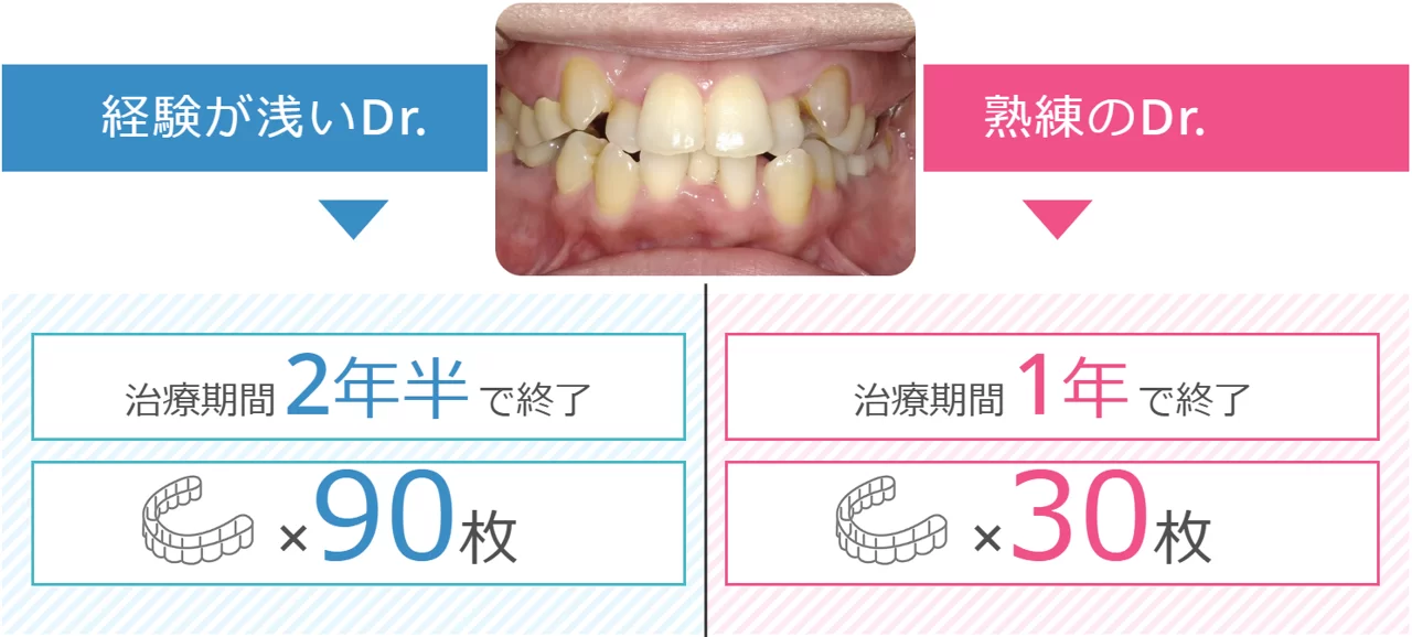 マウスピース矯正は、担当する歯科医師によって、治療までの期間にこれだけの差が出るのです。通院回数はもちろん治療に要するマウスピースの枚数も少なくなるので、当然費用も安価となります。